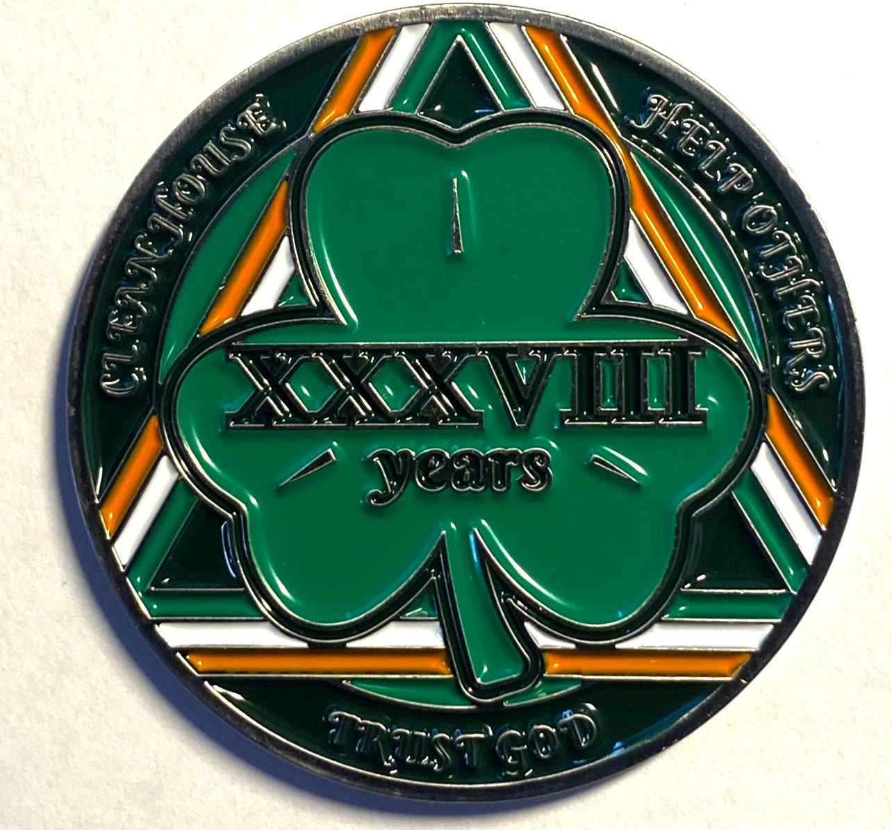 - Recovery AA Chip done in the colors of Ireland with big green shamrock on front with years of sobriety/recovery in the center.