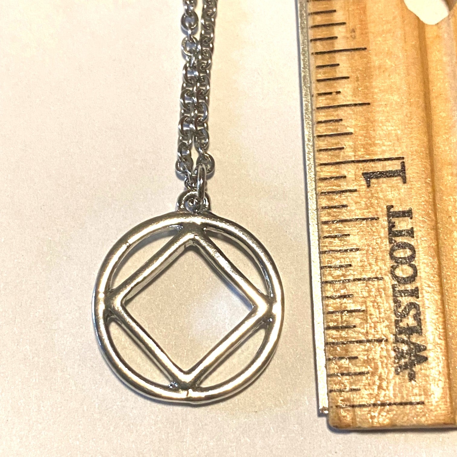 The NA Symbol Serenity Necklace is an NA symbol Pendant with a 17" chain. Classic and versatile, this Narcotics Anonymous necklace is perfect for daily wear and pairs beautifully with any outfit. Comes in a black gift box.