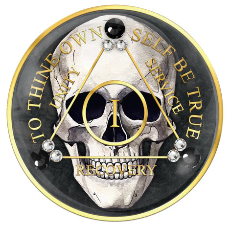 On the Front: White Skull on a black background with the words: To Thine Own Self Be True, with Unity - Service - Recovery and your anniversary year in Roman Numerals, embellished with Jet Black and White Crystals (years 1-40 only).